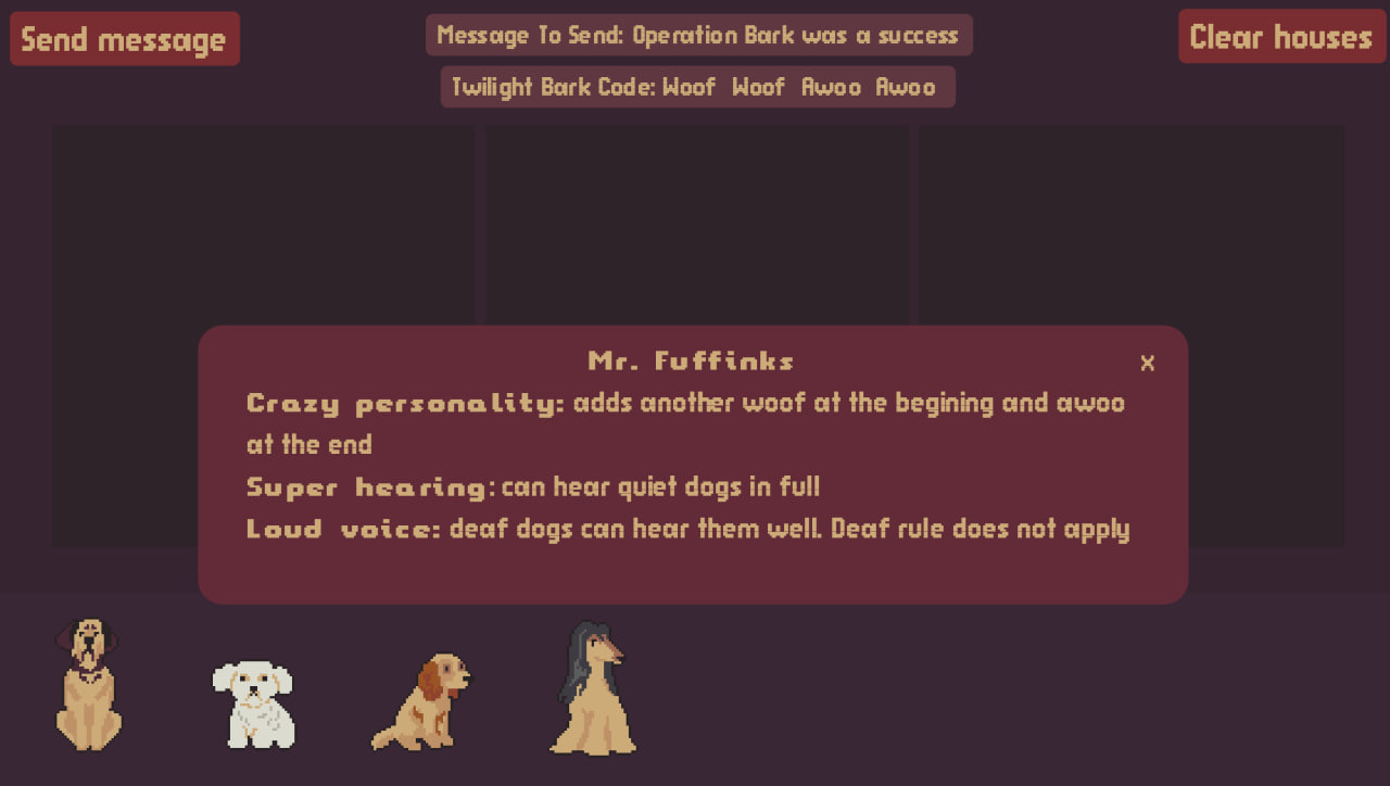 Build a chain of dogs to deliver a message, but keep in mind their little quirks!